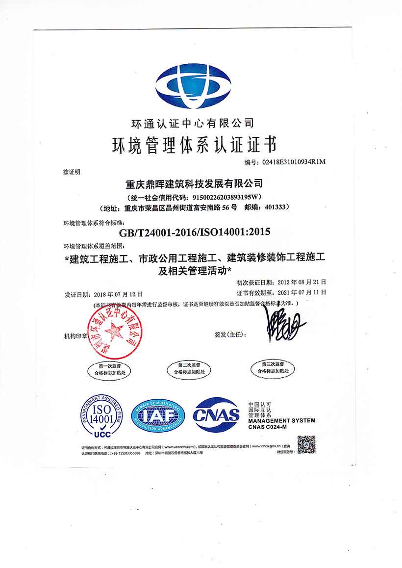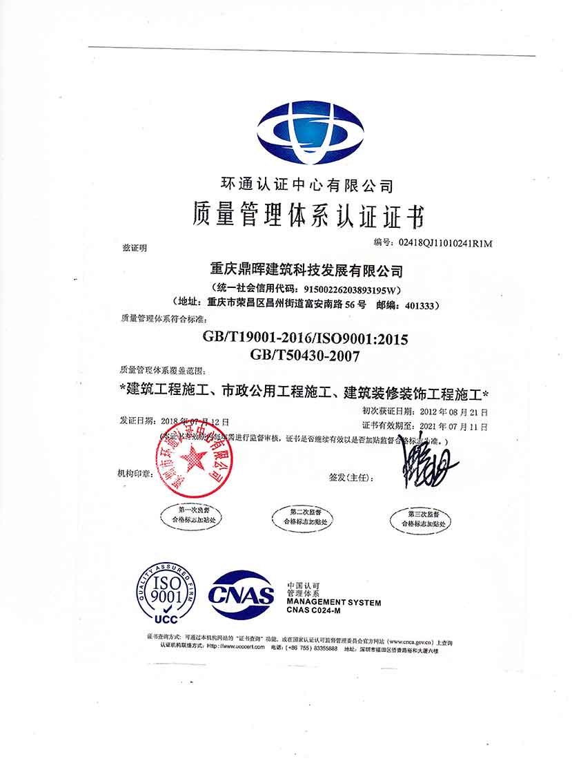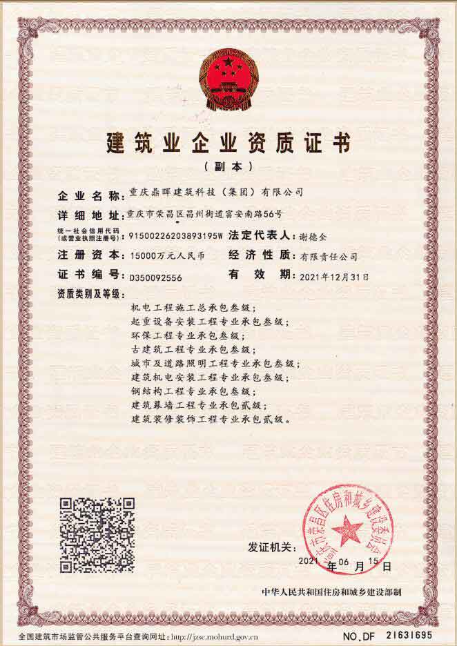 重庆鼎晖建筑科技(集团)有限公司(以下简称鼎晖建科)成立于2001年8月31日,注册资本1.5亿元。拥有房屋建筑施工总承包壹级资质、装饰装修工程专业承包壹级资质、建筑幕墙专业承包贰级资质等,通过IS09001 质量管理体系、ISO14001环境管理体系认证及OHSAS18001职业健康安全管理体系。
